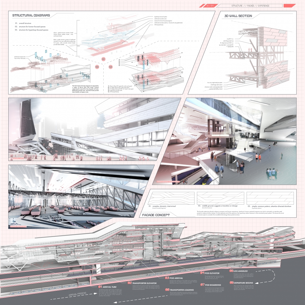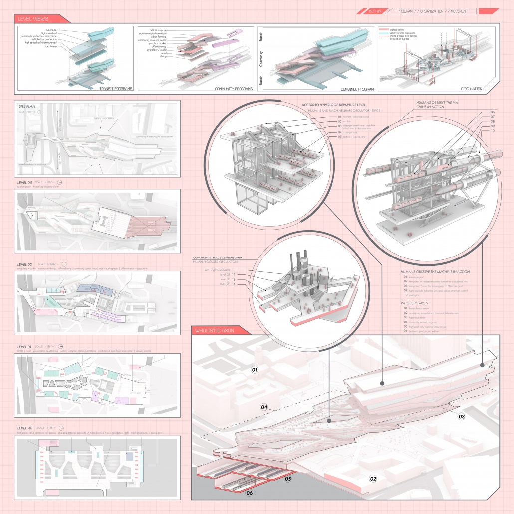 My answer is a reevaluation of the transit center typology which sees the typical structural canopy that commonly blankets transit centers injected with program. This is executed in conjunction with a heavy emphasis on community-focused spaces. The massing of the building sees transit systems barred from the ground plane, which is reserved for people. High speed rail and metro systems fall to subgrade levels, enabling the unification of the east and west sides of the site. The hyperloop station is elevated to become an icon of LA’s new development. Community-based programs including retail, dining, urban farming, office sharing, and gallery spaces are housed in interwoven program containers that emerge from the ground and become the canopy that covers the underground rail systems. The massing’s emergence from the ground enables multiple points of access to an extensive roof garden.  The façade is angular and porous, evocative of movement and inviting to both people and light. Visitors explore the void space created by weaving program containers, easily accessing a variety of amenities. Travelers find and access their system of choice via a quick escalator or elevator ride.