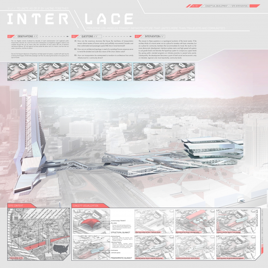 Interlace is an intermodal transit center located at Union station in Los Angeles. It accommodates for hyperloop, highspeed rail, metro, and bus systems, in addition to extensive community-based programs. A mixed-use tower development to the south explores the connection between transportation and living.