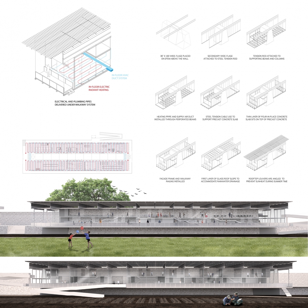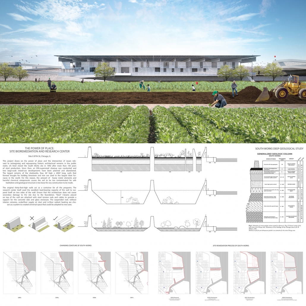 This project draws on the power of place and the intersection of issues relevant to re-imagining and re-purposing historic architectural remains in the public realm. US Steel closed the South Works site in 1992 after more than 100 years of steel production. Since then, an EPA-supervised cleanup was conducted and two large-scale mixed-use developments have been planned and abandoned. This 440-acre former industrial site continues to be plagued by issues of soil contamination. The largest remains of the steelworks, four, 40í high x 2000í long, walls that formed troughs for holding limestone and iron ore used in the largest blast furnaces in the world. For this reason, the amount of heavy metal elements and harmful chemical components causes the soil to be too contaminated for safe habitation and geological structure is too loose for any construction to be made.