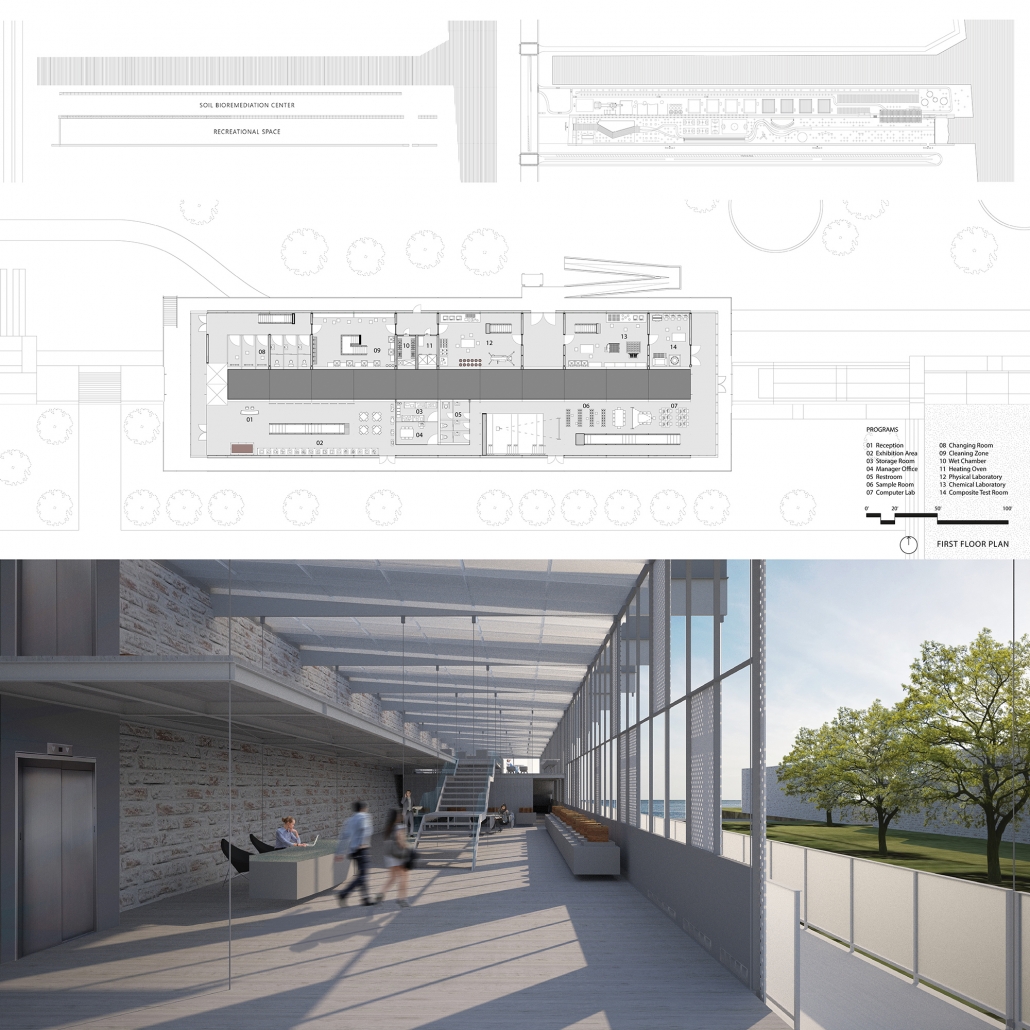 The original thirty-feet-high walls act as a container for all the programs as well as visually separating the public from the private sector. At the same time, the wall provide a walkway and observation decks for visitors to observed a panoramic view of the soil remediation process. The research center itself used the excellent load-bearing capacity of the wall to suspend itself on two sides of the wall. Ensure that the architecture does not cause secondary damage to the site due to the foundation. ìSteelî I-beams placed on top of the wall are attached with ìsteelî tension rods and cables to provide a support for the concrete slab and glass enclosure. The suspended roof, without interior columns, underfloor supply air duct and in-floor radiant heating are chosen as a system to created universal space that could be adapted to new uses.