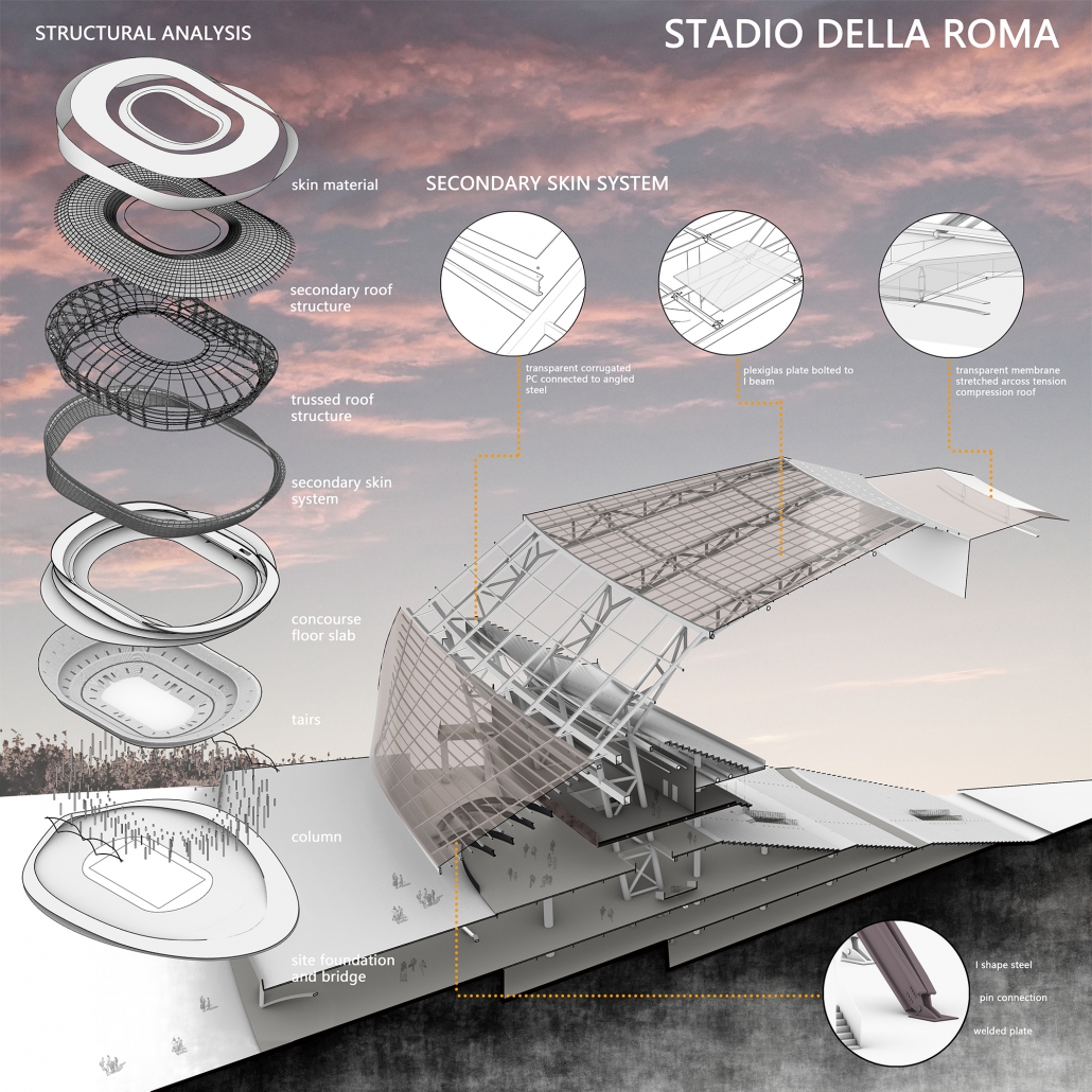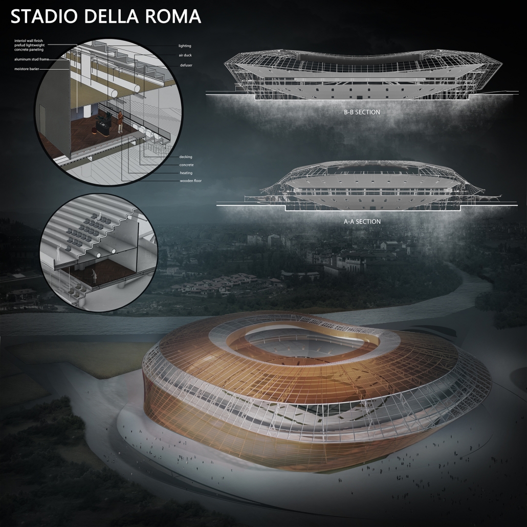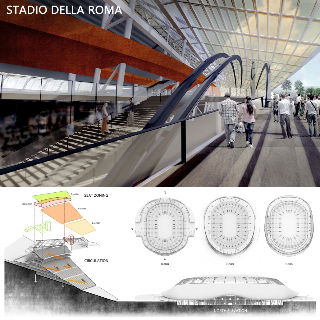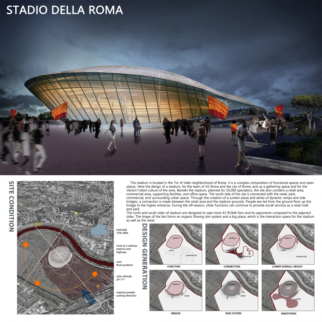 The stadium is located in the Tor di Valle neighborhood of Rome. It is a complex composition of functional spaces and open plazas. Here the design of a stadium, for the team of AS Roma and the city of Rome, acts as a gathering space and for the vibrant Futbol culture of the area. Besides the stadium, planned for 50,000 spectators, the site also contains a retail area, commercial area, supporting facilities, and office space. The south side of the site is connected with the retail, park, commercial, and surrounding urban space. Through the creation of a sunken plaza and series of dynamic ramps and side bridges, a connection is made between the retail area and the stadium grounds. People are led from the ground floor up the bridge to the higher entrance. During the off-season, other functions can continue to provide social services as a retail mall and park.