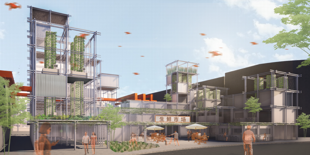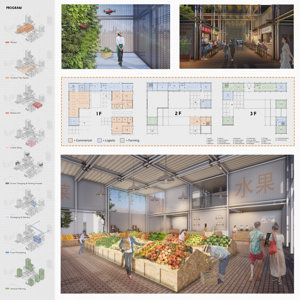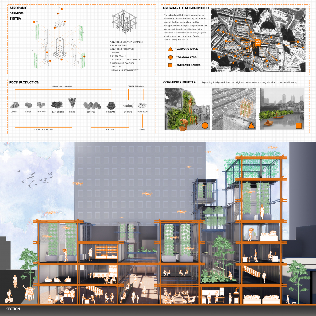 Traditional food markets are some of the most important community spaces in Chinese culture, but they also raise concerns over hygiene and food safety. The Hongkou Hub seeks to provide the strong community spaces that traditional markets offer, while improving on some of their shortcomings. Through an on-site ultra-efficient aeroponic farming system that utilizes drone-assisted harvesting, clean and fresh food can reach the consumer within minutes of being harvested. In addition to the market, a restaurant, food vendor stalls, and a coffee shop provide additional spaces for the local community to enjoy and serve as economic stimulators. The on-site teaching kitchen adds an educational aspect to the project and can teach the local community about healthy eating, and modern urban farming techniques. The Urban Food Hub serves as a center for community food-based bonding, but in order to meet the food demands of bustling Shanghai and the Hongkou neighborhood, our site expands into the neighborhood with additional aeroponic tower modules, vegetable growing walls, and hydroponic farming systems along the stream. The food production is expanded beyond just the food hub, as the aeroponic growing towers and green growing walls are placed throughout the Hongkou neighborhood. This initiative creates a strong sense of connection visual identity within the neighborhood.