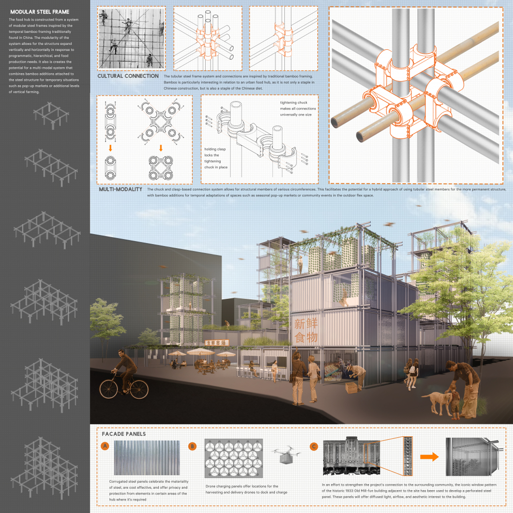 The design of the “Hongkou Hub” is sensitive to its surroundings and the community it aims to serve. The food hub is constructed from a system of modular steel frames inspired by the temporal bamboo framing traditionally found in China. The modularity of the system allows for the structure expand vertically and horizontally in response to programmatic, hierarchical, and food production needs.The modular steel framing system hearkens to the bamboo framing historically used for a number of temporary structural applications all across China. The modularity of the system allows for the structure expand vertically and horizontally in response to programmatic, hierarchical, and food production needs. The chuck and clasp-based connection system allows for structural members of various circumferences. This facilitates the potential for a hybrid approach of using tubular steel members for the more permanent structure, with bamboo additions for temporal adaptations of spaces such as seasonal pop-up markets or community events in the outdoor flex space. Bamboo is particularly interesting in relation to an urban food hub, as it is not only a staple in Chinese construction, but is also a staple of the Chinese diet. In an effort to further strengthen the project’s connection to the surrounding community, the iconic window pattern of the historic 1933 Old Mill-fun building adjacent to the site has been used to develop a perforated steel panel. These panels will offer diffused light, airflow, and aesthetic interest to the building. Additional Façade options include corrugated steel panels which celebrate the materiality of steel, are cost effective, and offer privacy and protection from elements in certain areas of the hub where it’s required, and drone charging panels that offer locations for the harvesting and delivery drones to dock and charge.