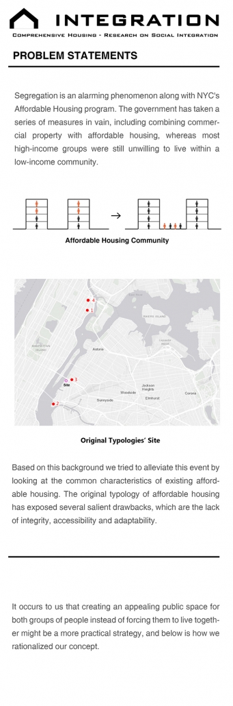 Segregation has been an alarming phenomenon along with NYC’s Affordable Housing program since 1934, the development of NYCHA. The government has taken a series of measures but in vain, which include combining commercial housing with affordable housing, as well as locating them at affluent neighborhood etc. The core issue is that even though two group of people were bound together physically, without overlapping activity pattern and social interaction during their residential life, most high-income groups were still unwilling to engage with and live within a low-income community.