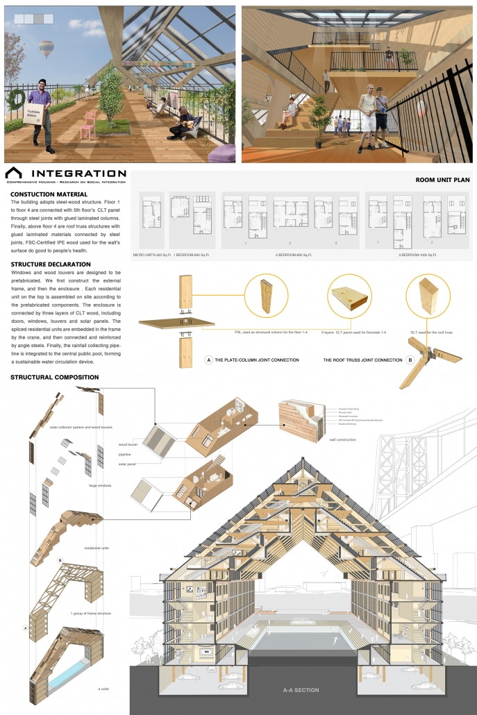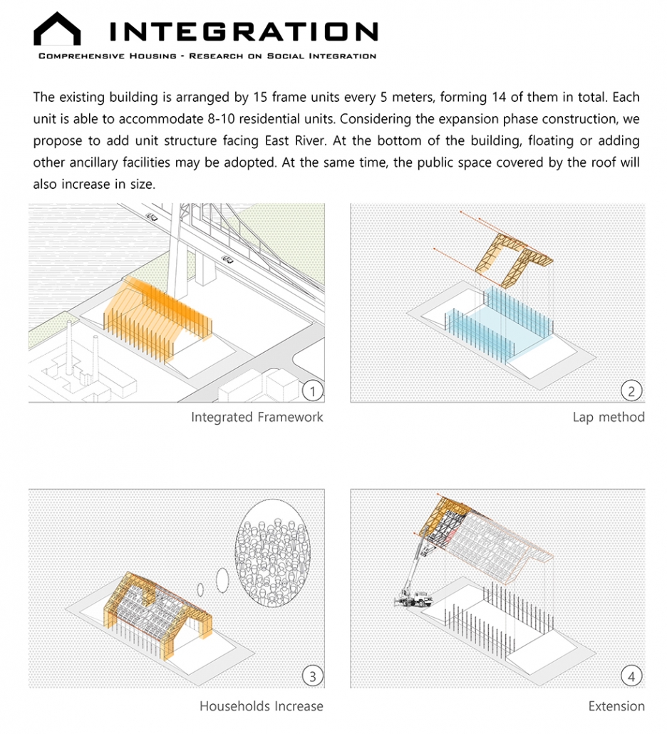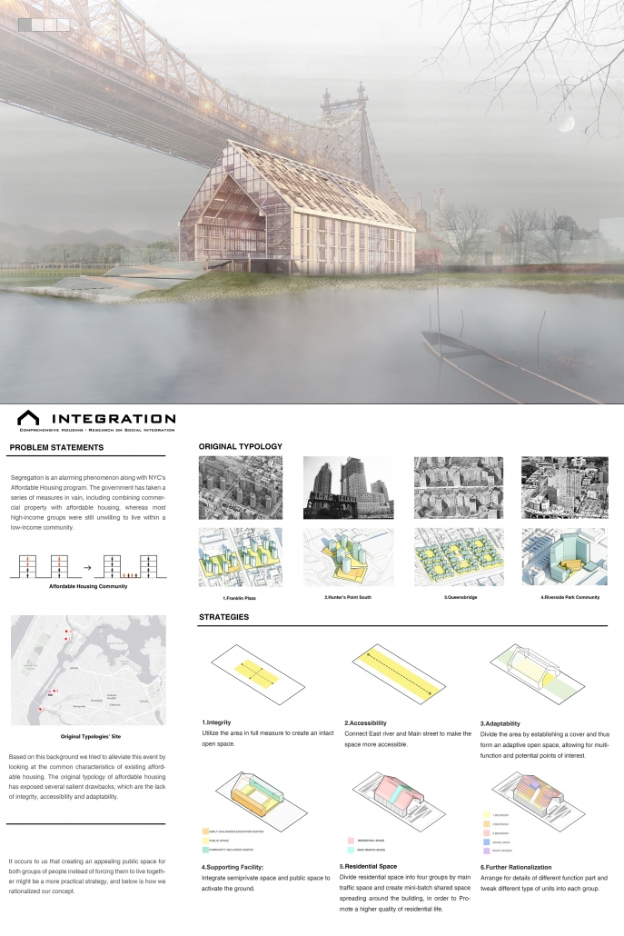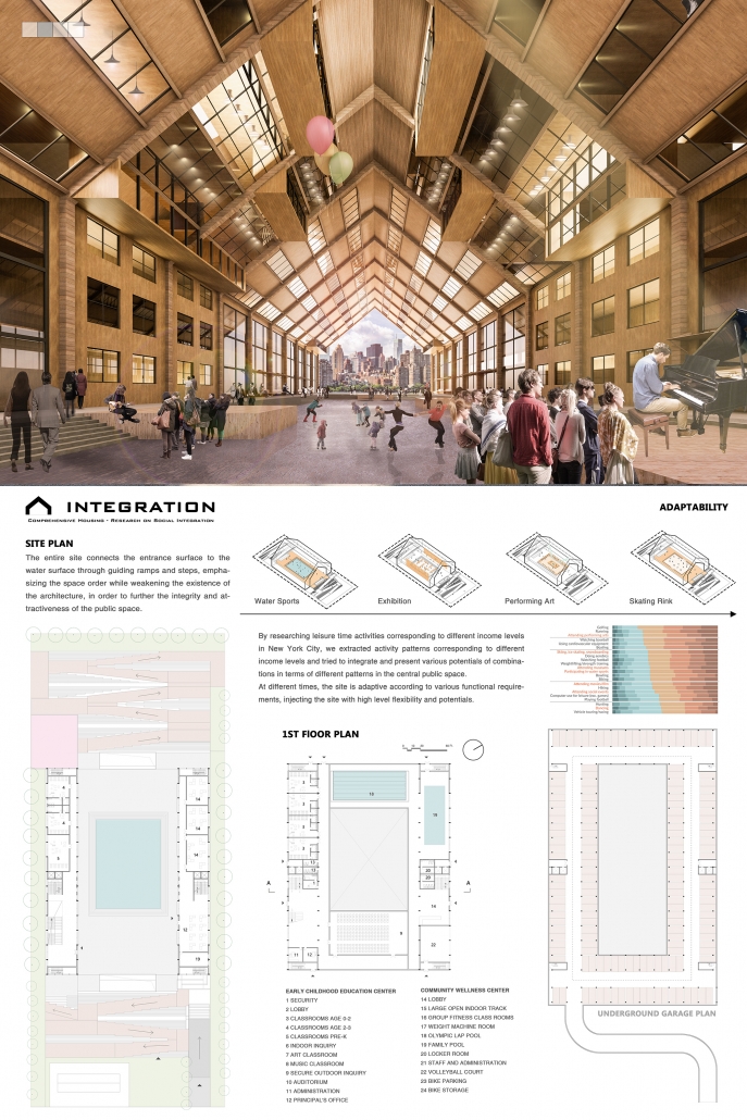 Based on data related to leisure time activities of people living in New York City, we extracted activity patterns corresponding to different income levels, and tried to integrate and present various potentials forms of interaction between the two groups of people. Hence we proposed a new typology for affordable housing and tried to establish a way more accessible and intact open space, which serve as a core space to activate the ground area, in conjunction with signifying social connectedness. Flowing with hours, days and seasons, this site is adaptive according to various functional requirements, bringing the site with high level flexibility and many more potentials for social activities. Meanwhile, it connects the entrance surface to the water surface through guiding ramps and steps, emphasizing the space order while weakening the existence of the architecture, with an intention to further the integrity and attractiveness of the public space.