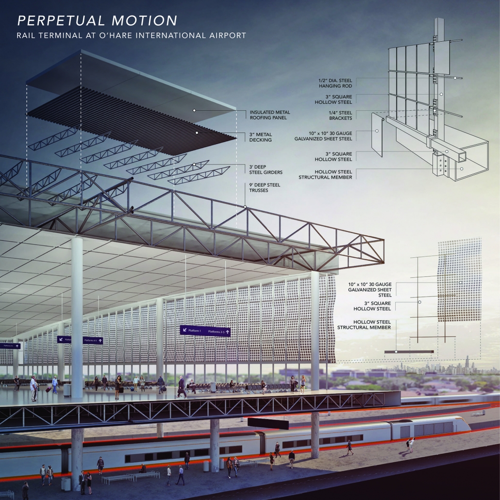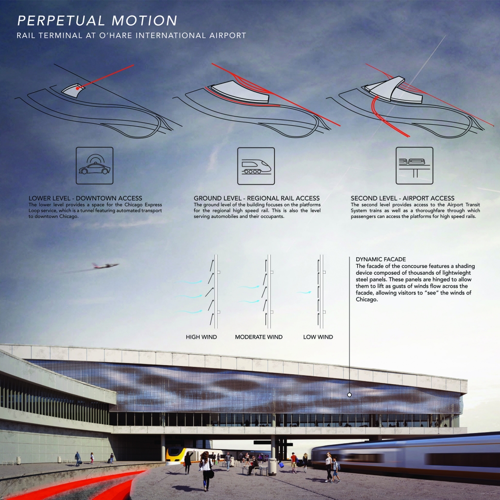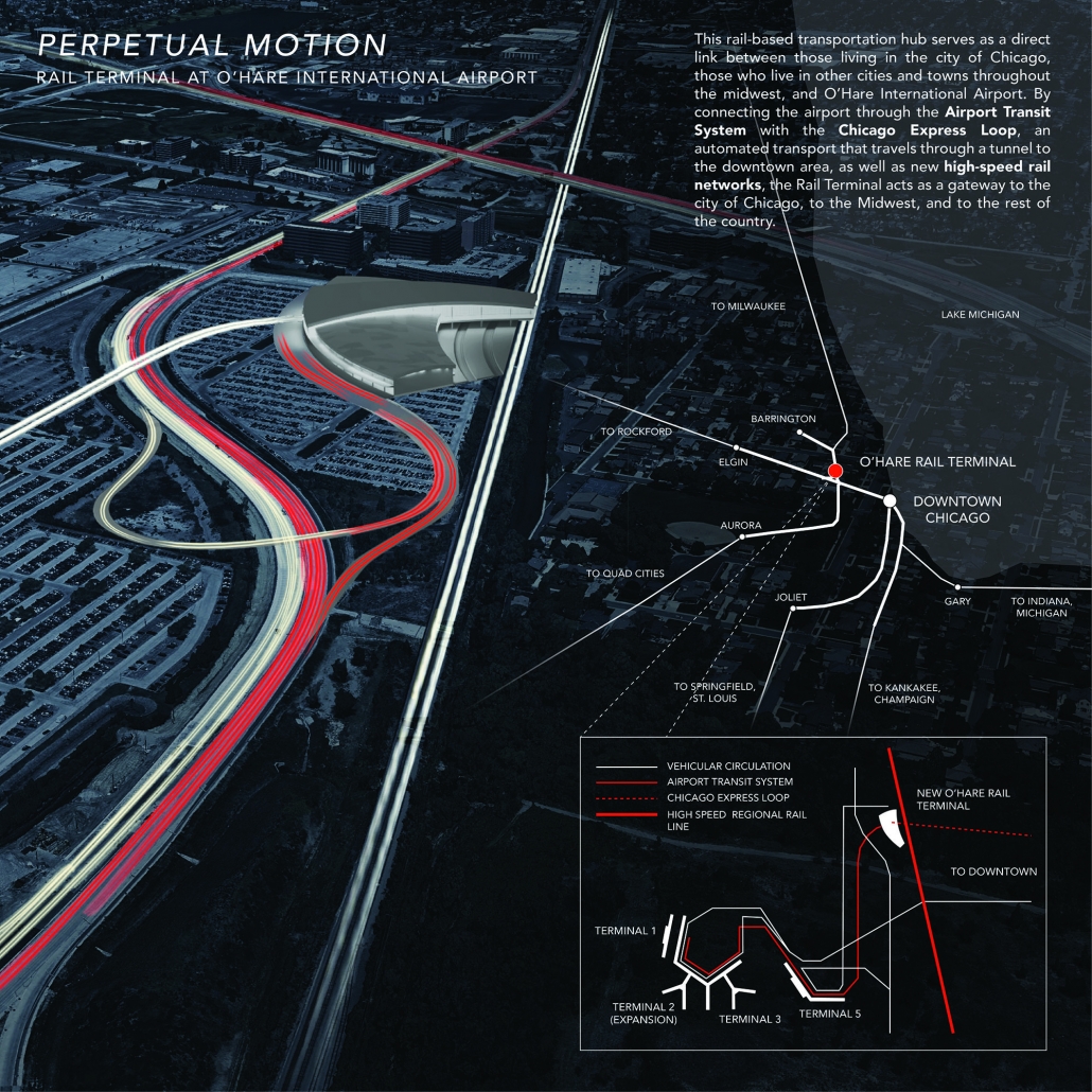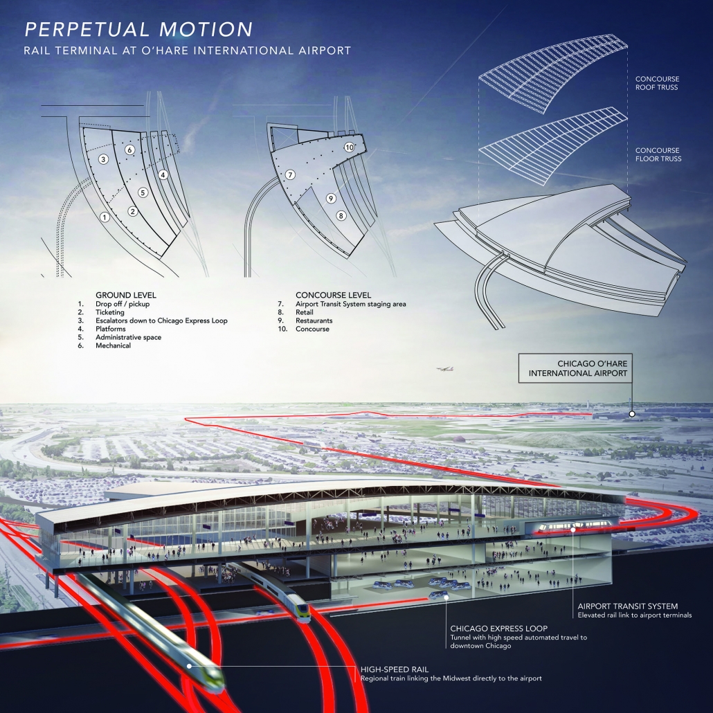 The Rail Terminal provides an intermodal transportation hub that connects three critical forms of transportation for the Chicago area. The first, the Airport Transit System, is a system of elevated rail lines that connect the Rail Terminal with the airport terminals of Chicago O’Hare International Airport. The lower levels of the building host the Chicago Express Loop, a new method of transportation developed by Elon Musk’s Boring Company, which would allow passengers to travel from O’Hare to downtown in just 12 minutes using automated vehicles that move through a tunnel. However, the main mode of transportation supported by the facility is high-speed rail. The design is driven by a connection to five train platforms, through which passengers will be able to access the suburbs of Chicago as well as major cities throughout the Midwest. Through these means of transportation, the Rail Terminal acts as a gateway to the city of Chicago, the Midwest, and to the rest of the country.