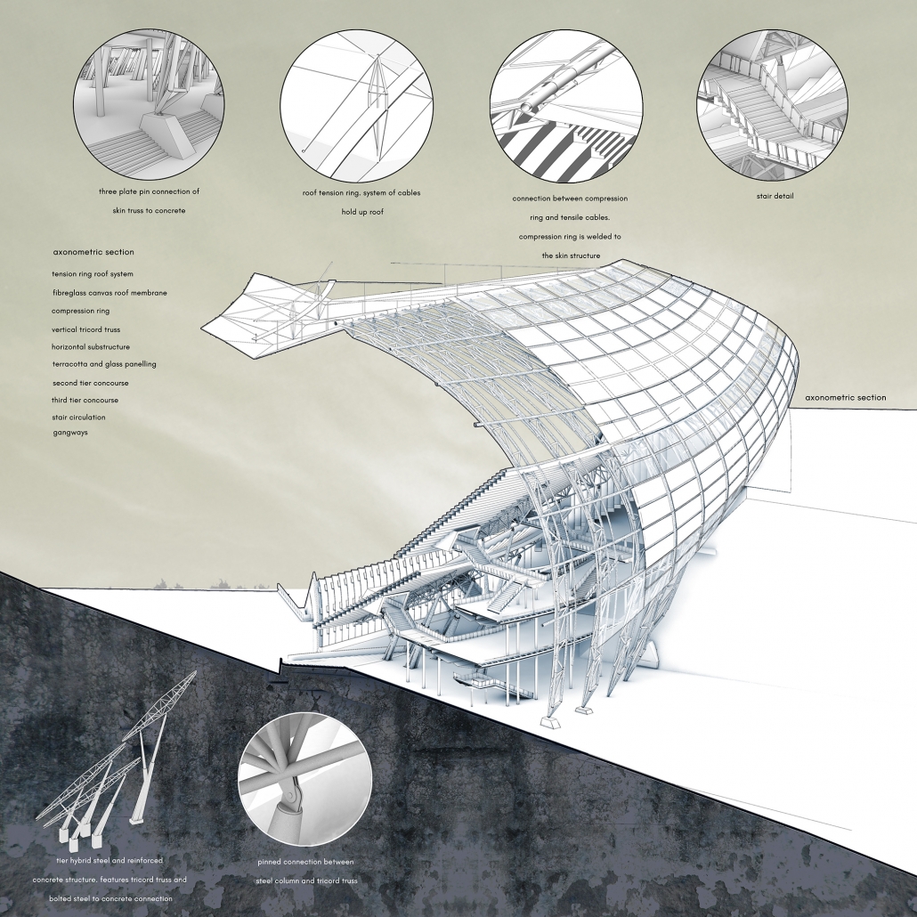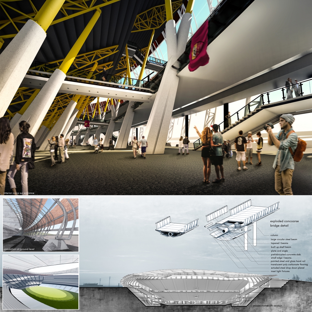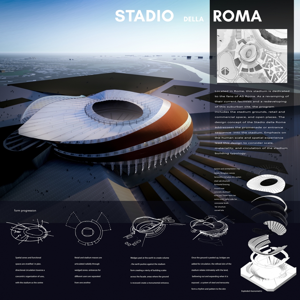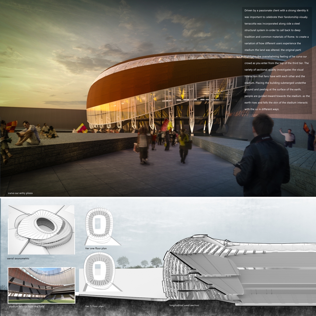 As the new house for AS Roma, the Stadio della Roma, located in the south of Rome, Italy, and flanking the Tiber River, speaks of the vitality and energy of the AS Roma soccer team’s fans, without, however, neglecting those characteristics that make of Rome a remarkable city. Paramount in the design was addressing the promenade or entrance sequence into the stadium. Like a relic of old Roman concrete, or ancient architectural ruins, the stadium lies embedded in the earth. All its layers are created by the intersection of massive earthen architecture and cutting edge steel structure, which with its repeating vertical trusses draw the eye upwards. Emphases on the human and spatial experience lead this design to consider scale, materials, and circulation of the stadium building typology. With a unique consideration of the variety of users, which gather for soccer matches, the earth was integrated as part of the facade to create intentional moments of underplayed elegance and monumental entrance. Approaching the glass and terracotta form, bellowing out from the ground, fans are drawn into the airy lace of white steel trusses, elegantly lit by twilight lights. Both the monumental facade, exposed by the carved land, and the cavernous concourse space, stretched by sculptural bridges, celebrate the fandomship of the unique AS Roma team. Driven by a passionate client with a strong identity, it was important to celebrate their fandomship visually. Terracotta was incorporated alongside a steel structural system to call back to deep tradition and common materials of Rome. To create a variation of how different users experience the stadium, the land was altered. The original parti highlights the overwhelming feeling of the Curva Sud crowd as you enter from the top of the third tier. The variety of sectional quality investigates the visual interaction that fans have with each other and the stadium. By placing the building partially undergrounds and peeling the surface of the earth, people are guided inward towards the stadium. As the ground rises and falls, the skin of the stadium interacts with the fans in different ways.