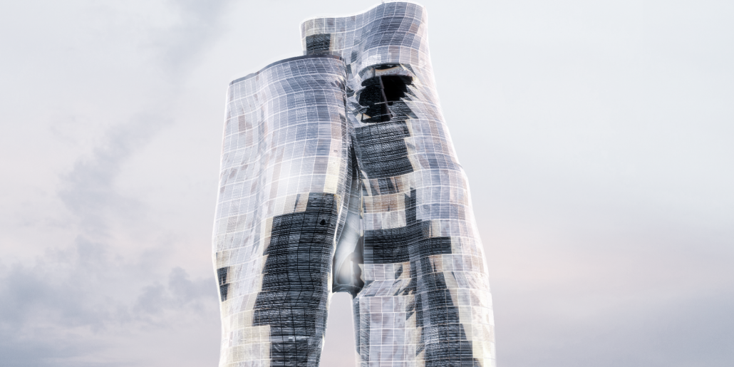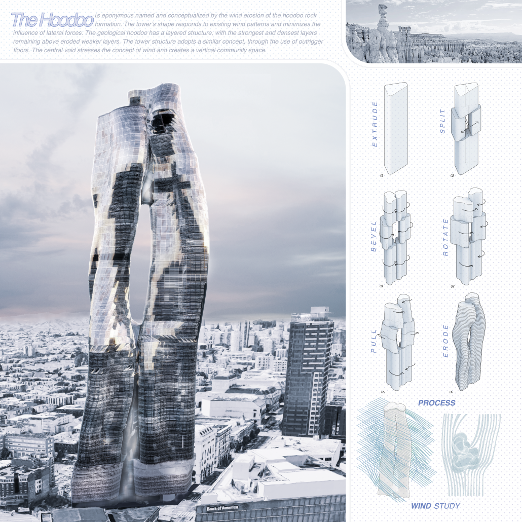 The Hoodoo tower interprets the wind erosion of a rock formation. Its shape responds to existing wind patterns and minimizes the influence of lateral forces. The geological hoodoo has a layered structure, with the strongest and densest layers remaining above eroded weaker layers. The tower structure adopts a similar concept, using the outrigger floors. The central void stresses the concept of wind and creates a vertical community space.