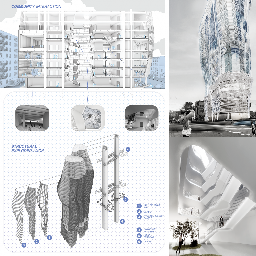 We designed the podium to address the intersection of two major streets of SF with an open space on the first floor. The podium atrium connects Market and Oak streets. It also provides the view to eroded towers as well as the city which gives the sense of place to the visitors. The Podium also includes such spaces as outside cafe, rock formation museum, roof garden and other civic spaces.