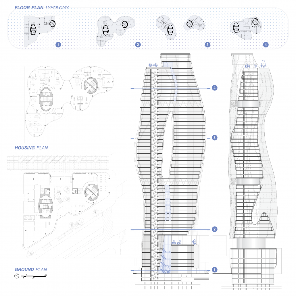 The tower provides the housing with 450+ units varying from 6 to 10 units per floor. The Housing Unit is a segment of a floor plate. This allows to make every room of a unit have different views. The balconies of a unit appear in certain rooms to create an eroded pattern from exterior.