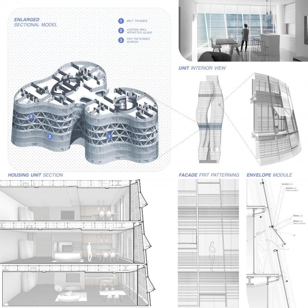 The envelope is a double skin facade system for the tower and a screen system for the podium. Horizontal frit creates a pattern which would correspond with the erosion concept, decrease the sun exposure, and create living shadows in the apartment units. The podium system repeats the same pattern of frit using a terracotta screen instead.