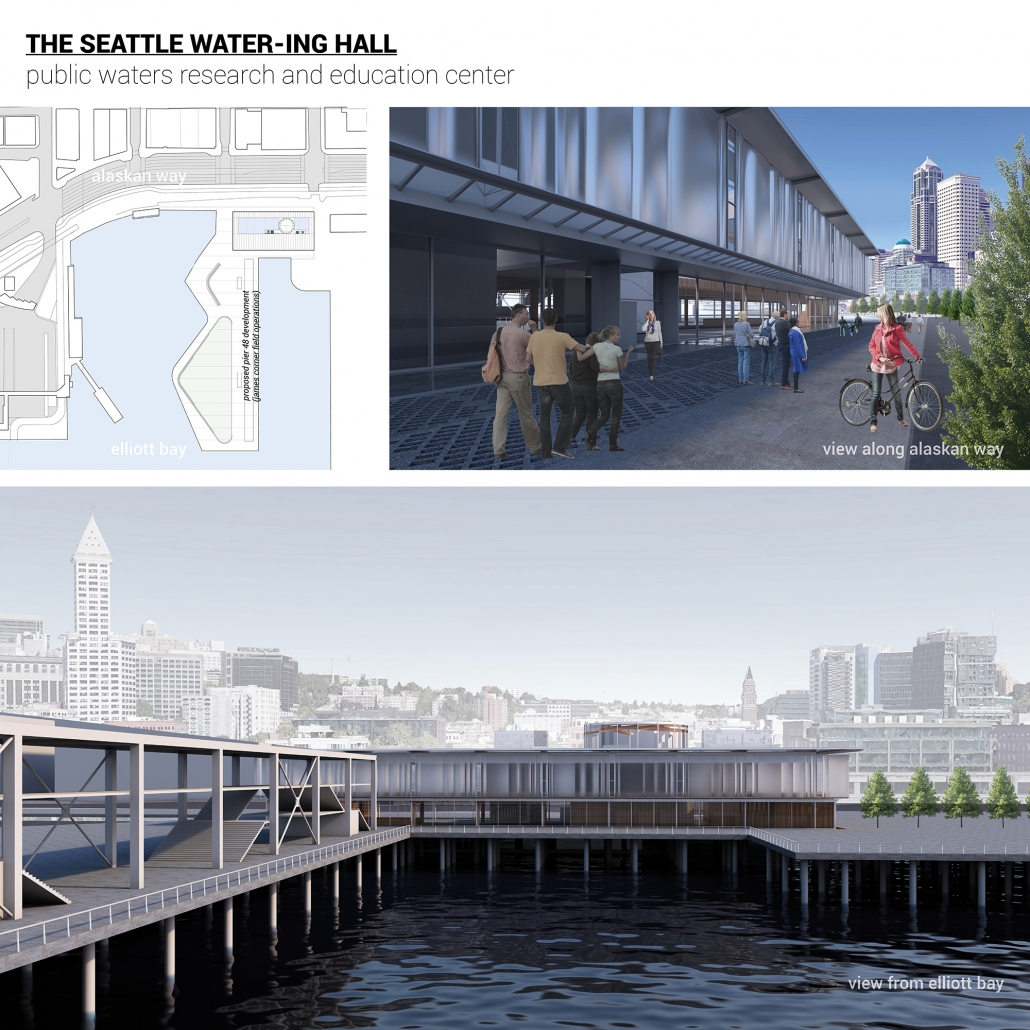Water is a universal and powerful force in all our lives, deserving to be celebrated. The Seattle Water-ing Hall (Water Research and Education Center) celebrates the importance of water research through an inviting public interior space along the Seattle waterfront organized around the theatrical experience of water.