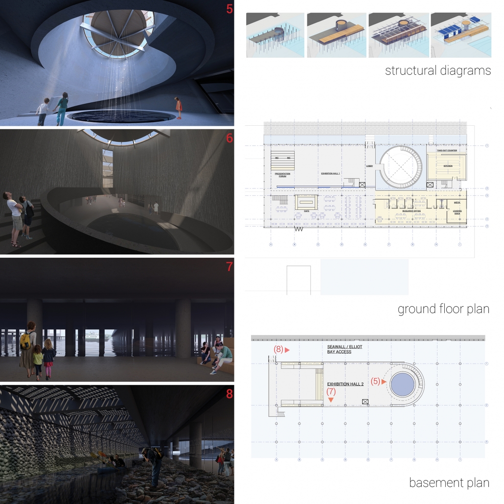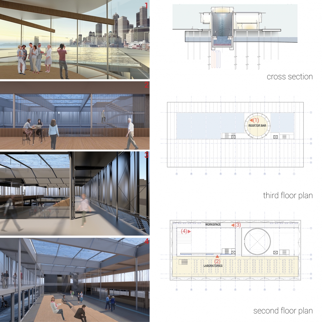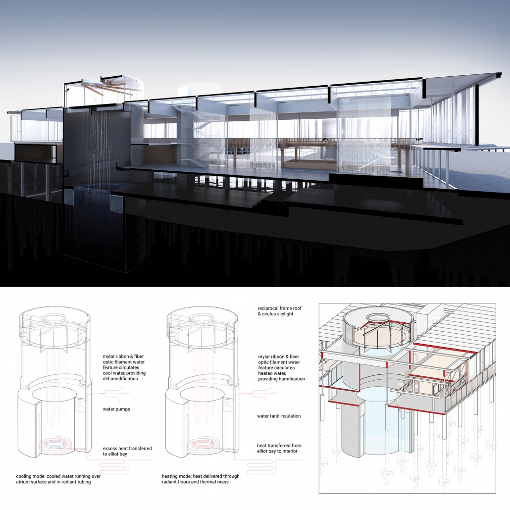 The building is an organized vertically as an open steel framework under a canopy of water and an envelope of light plastic film, or ETFE. The ground floor activates the street edge through an exhibition hall, cafe, take-out restaurant, and presentation space. The research office is a separated volume and platform. A strong cylindrical volume invites the public to journey down underneath the waterfront piers to discover and access the underworld of the waterfront, which is mostly built on piers and piles. A rooftop bar becomes a lookout point from which both the natural context of the Olympics, Puget Sound, and downtown Seattle are visible all at once.