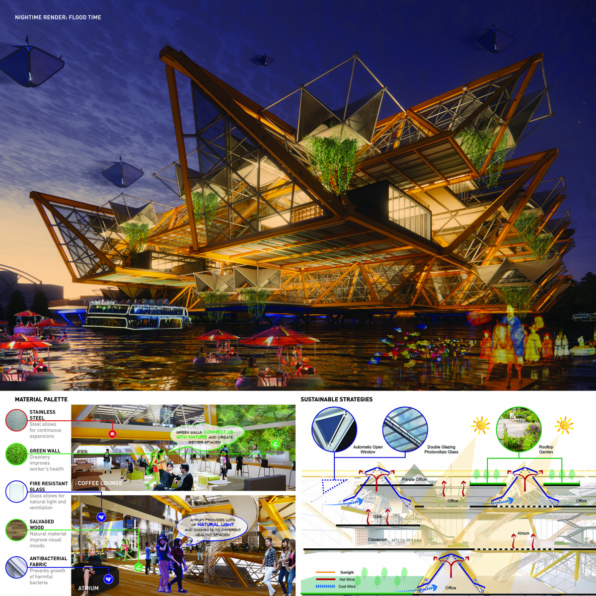 Opening edges along all sides of the building allows the public, and the office building, to flow into and through the site. Sunken plazas, green spaces which continuously flow from the ground into architecture help blur the line between architecture and landscape. Workers can move from office space to urban space to enjoy fountains design for civic recreation. Additionally, the lower levels are integrated into the upper urban spaces which allows retail, food vending and additional commercial spaces to share the urban landscape.
