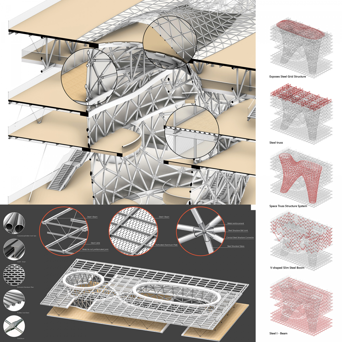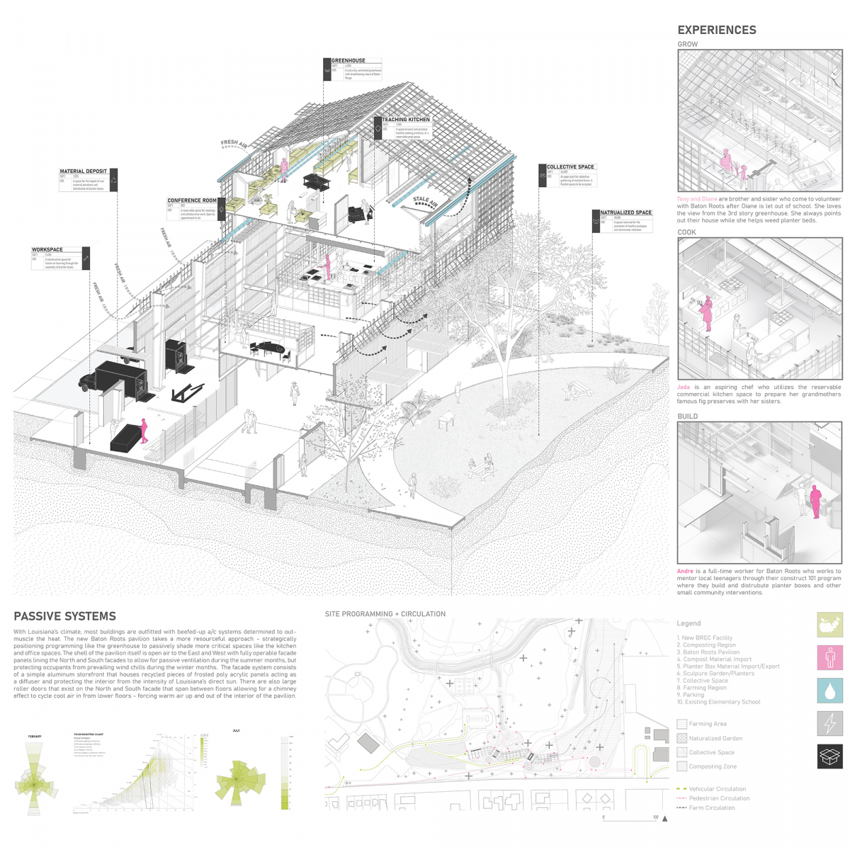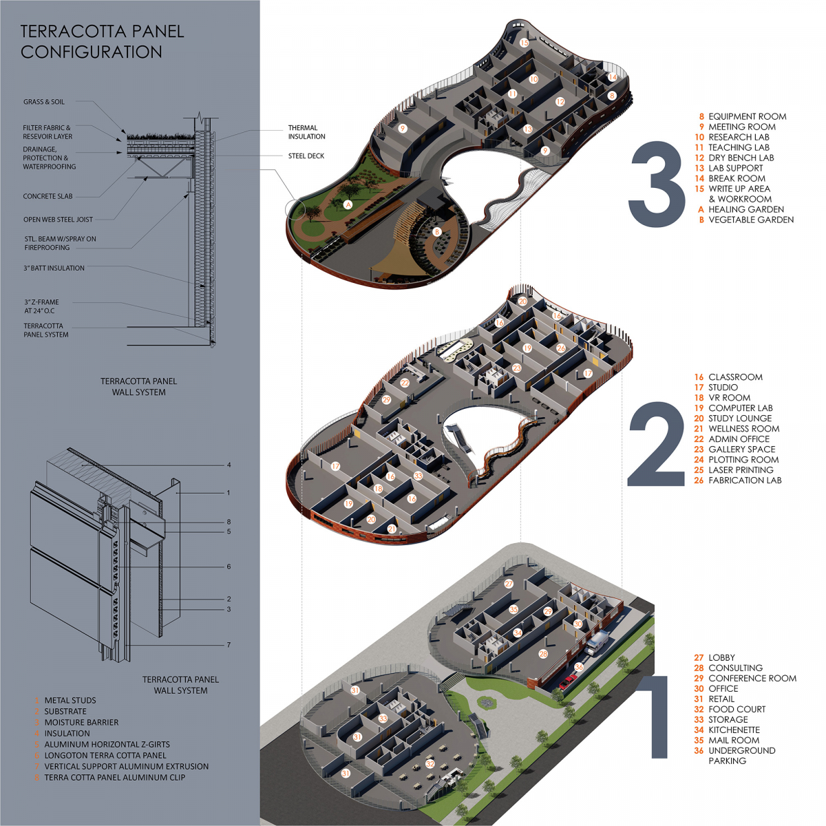 Occupant activity and distancing are emphasized through extending pedestrian routes and integrating a running ramp through the gardens and other areas. By enlarging the pedestrian traffic areas, these become spaces for socializing, sharing ideas, and creating visions of the future.
