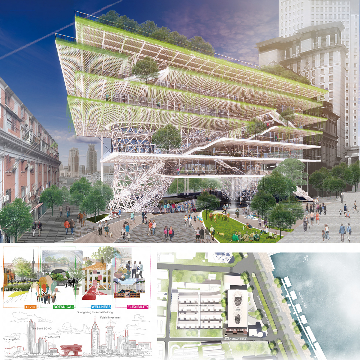 The urban center selected for this study is considered one of the most vibrant and active in the world. Shanghai, a city of twenty-five million, has over 700 regional headquarters. Most are in central Shanghai near the world-famous Bund area on the Huangpu River. Shanghai’s contemporary architecture is often adventuresome, experimental, and open to technological innovation. While our project remains committed to the Shanghai’s iconic architecture, it also builds a healthy and active relationship with pedestrians and nearby neighborhoods.