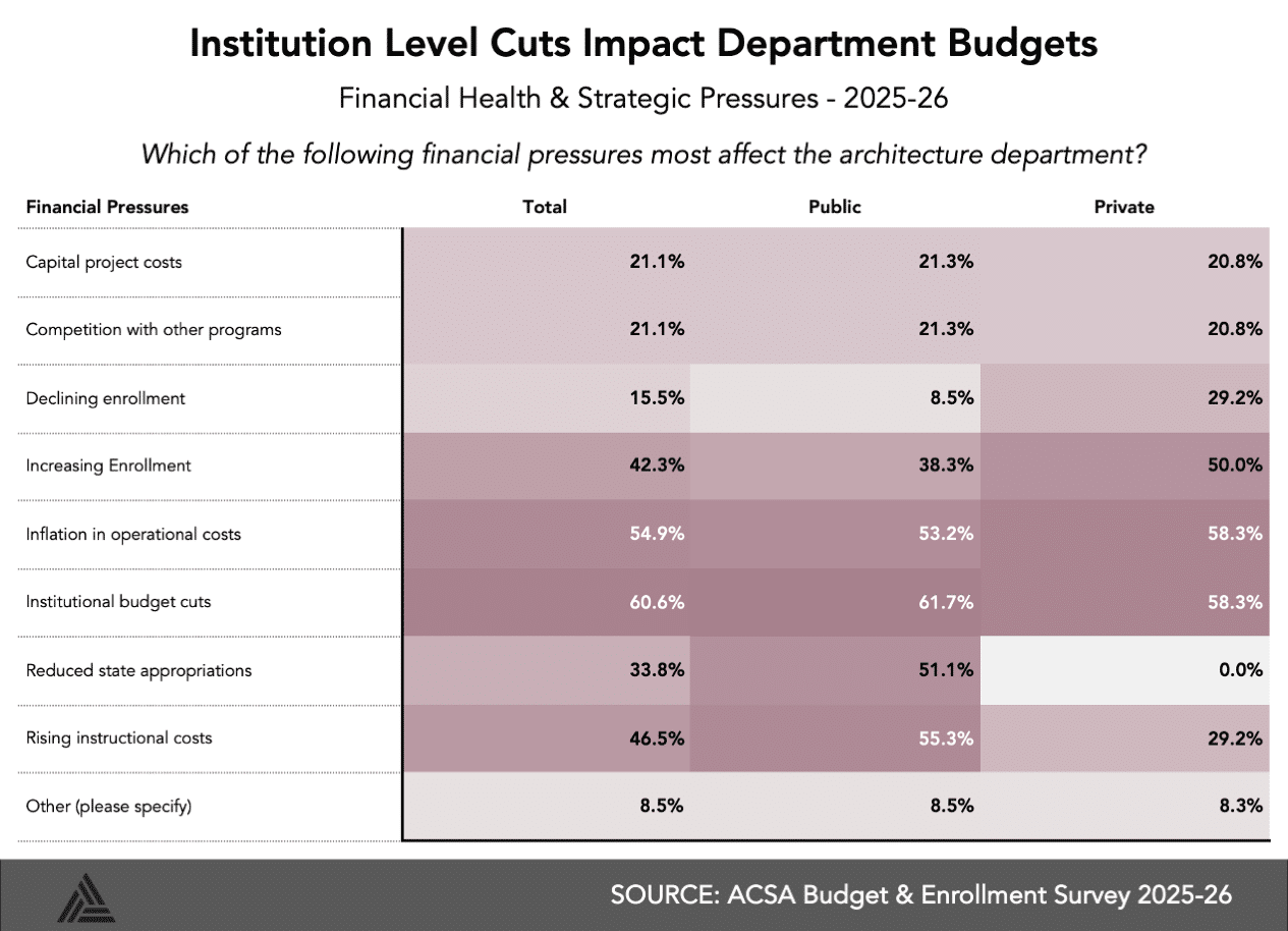 The annual survey is now in its sixteenth year asking schools to identify changes in budgets, enrollment, applications, and academic staffing over the previous year. ACSA members comprise both public and private institutions, primarily in the United States and Canada.